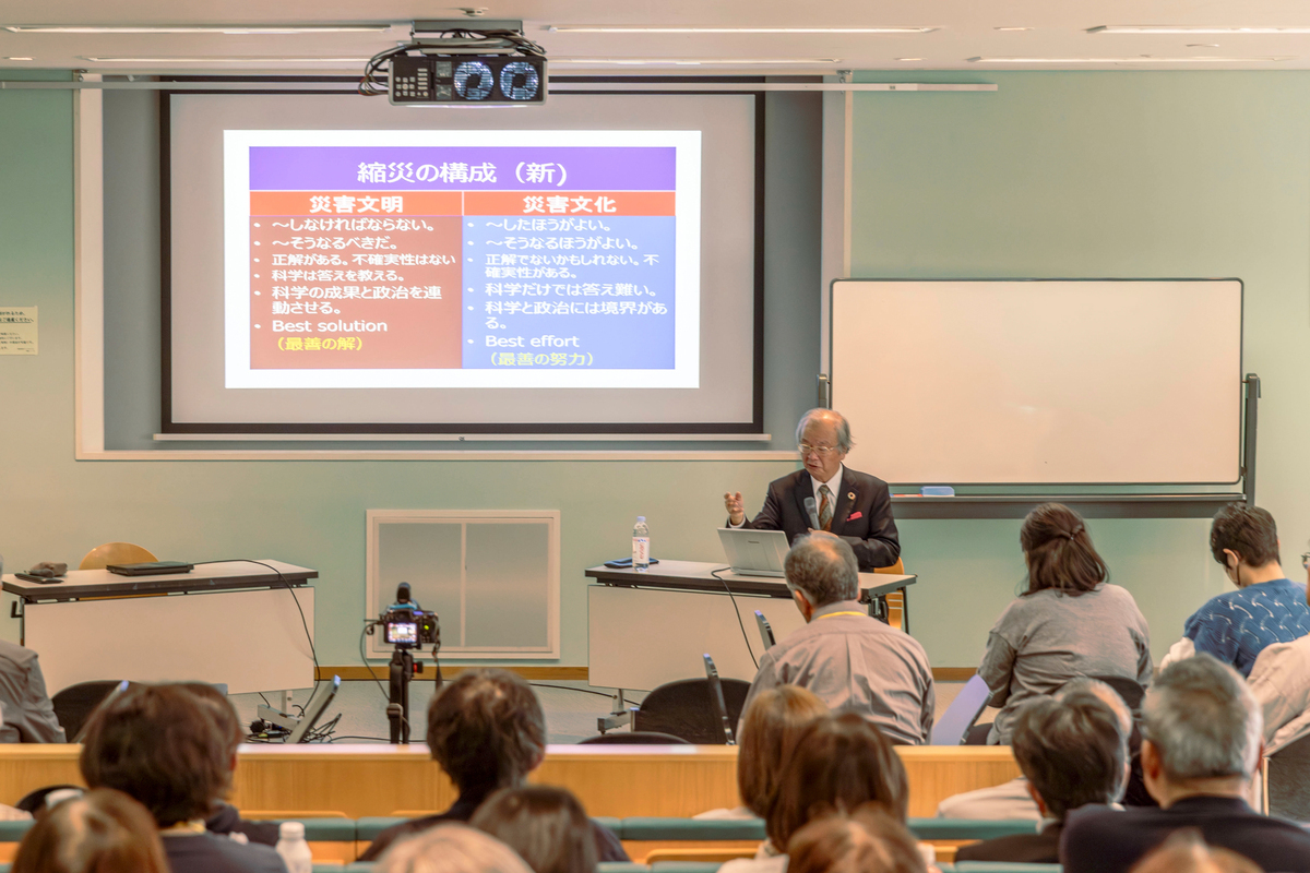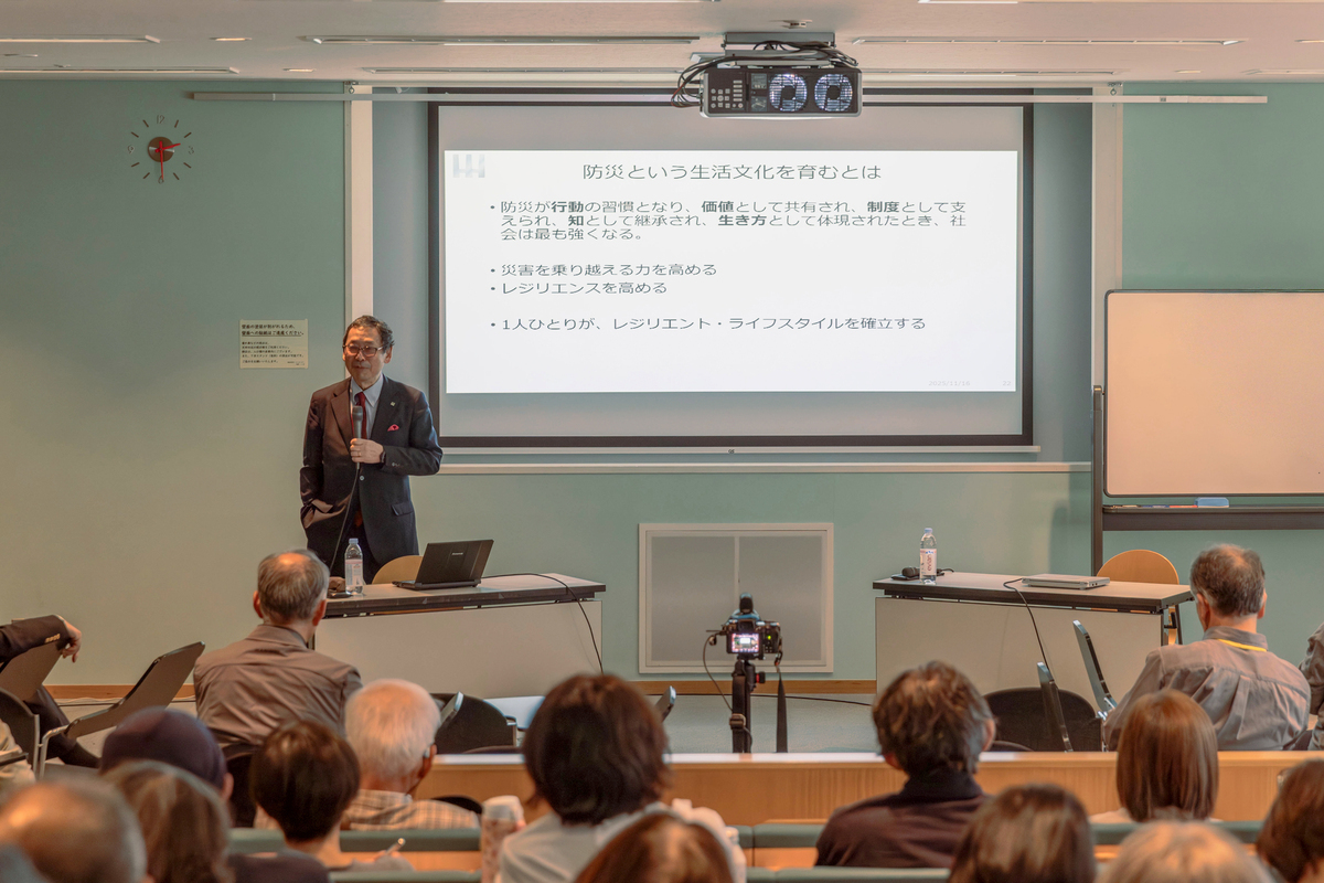 土砂災害で亡くなる人の90%は1階にいる。2階に上がるだけで助かる。それでも避難指示が出ても動かない人が多い。理屈が分かっていても行動につながらないのは、文化として身についていないからだと指摘されました。堤防を造ったり津波の高さを計算したりする科学的な対策は「文明」の力ですが、それだけでは足りない。大雨の夜に2階で寝る、揺れたら机の下にもぐる、そうした判断を理屈抜きに身体が動くレベルにまで落とし込む。科学と制度の「文明」に、暮らしの知恵としての「文化」が自然に溶け合って、どちらがどちらか区別がつかなくなっている──そういう状態を目指す必要があると河田先生は語られました。